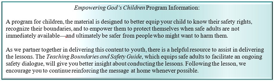 Each year, children and youth, along with a parent/guardian, will complete one safety lesson per year (6 total). This year’s safety lesson is Lesson 4 and is entitled, “Secrets, Surprises and Promises” and should be completed at home before March 31, 2026. The Teaching Safety—Empowering God’s Children Program will NOT be taught in the classroom.